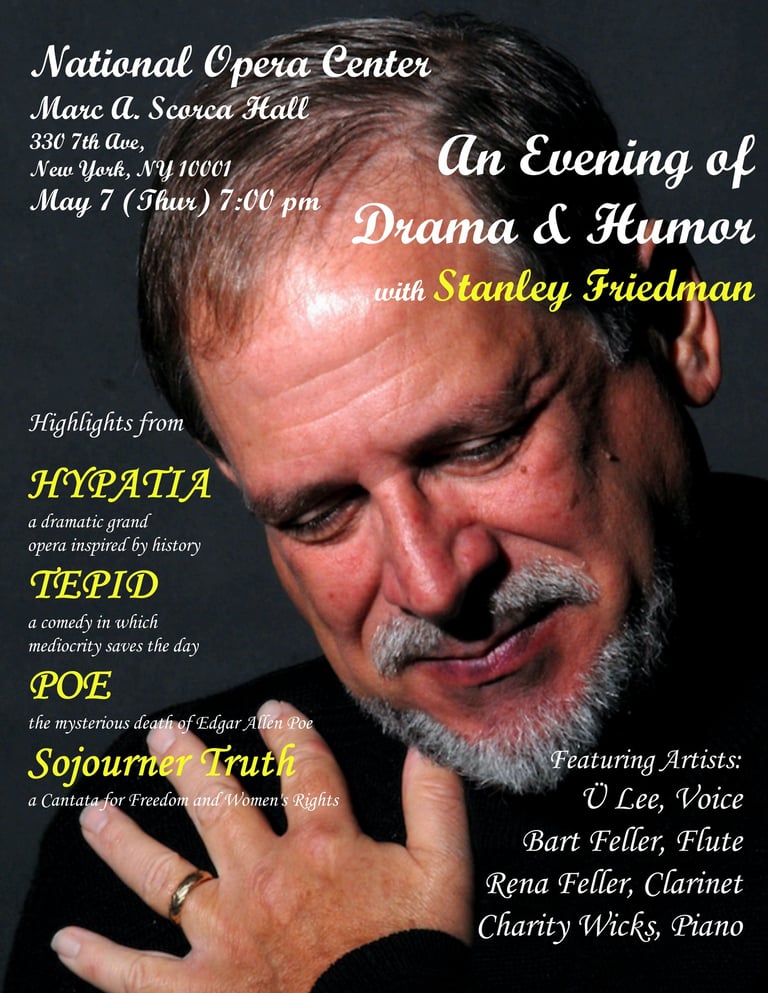 The poster on the right is Stanley Friedman. Ü met Stanley during the opera conference in Memphis in 2025. After listening to the first sample from his HYPATIA, Ü couldn't stop herself from listening to everything available on this composer's playlist. Ü believes she's found the Verdi of our time because of his daring and brilliant compositions that show off the voices, the orchestra, and humanity. With the intention to see more of Stanley's works performed in the world, Ü has shared about Stanley in several interviews worldwide. Ü is also taking a part in Stanley's work presentation in the National Opera Center in NYC in May 2026.